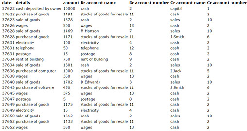The purpose of this page is to demonstrate how we can derive a Trial Balance from a list of bookkeeping transactions by using a series of in built techniques. This page can be read in conjunction with the page we prepared earlier: Using the SUMIF Function to Prepare a Profit & Loss Account ... the link is on the left.